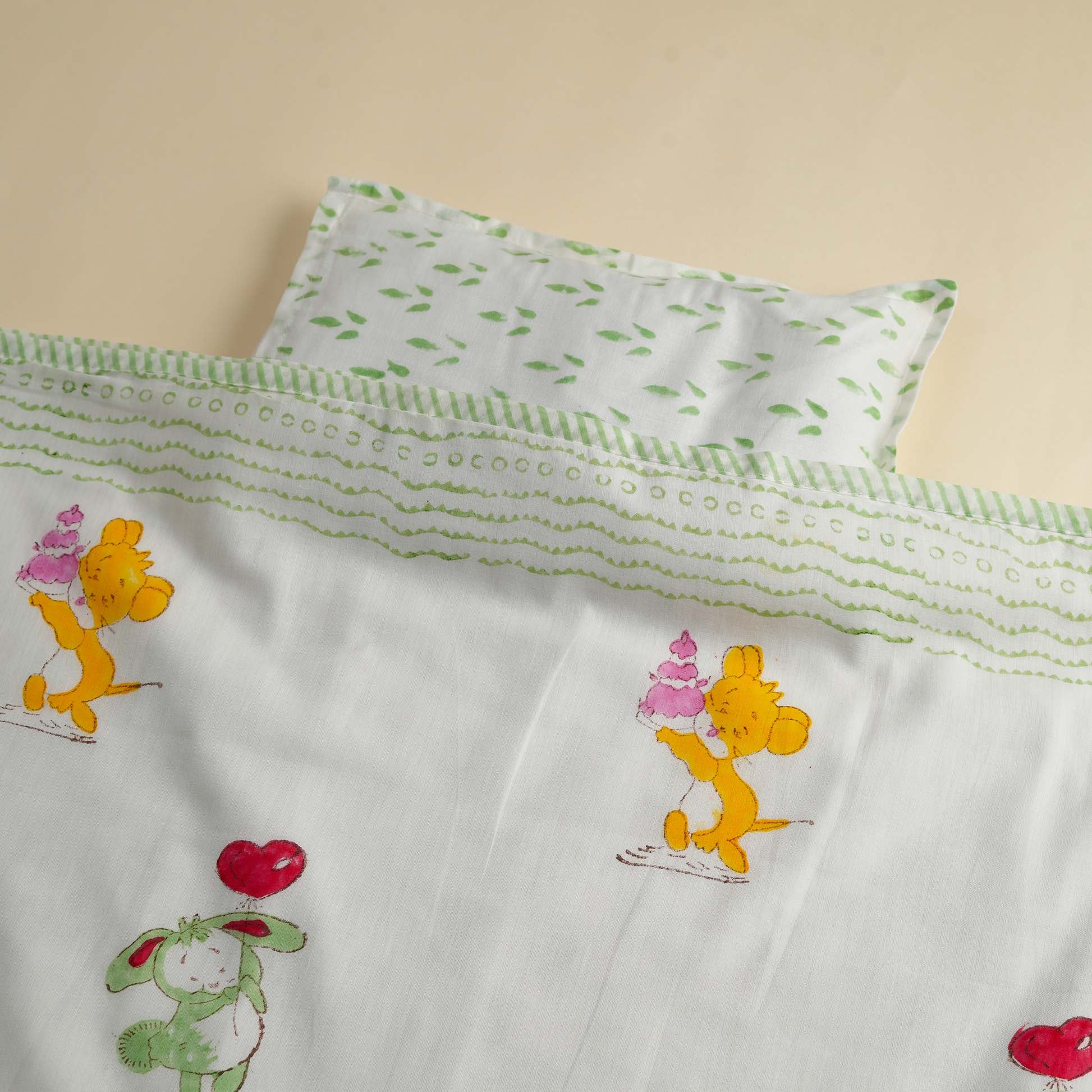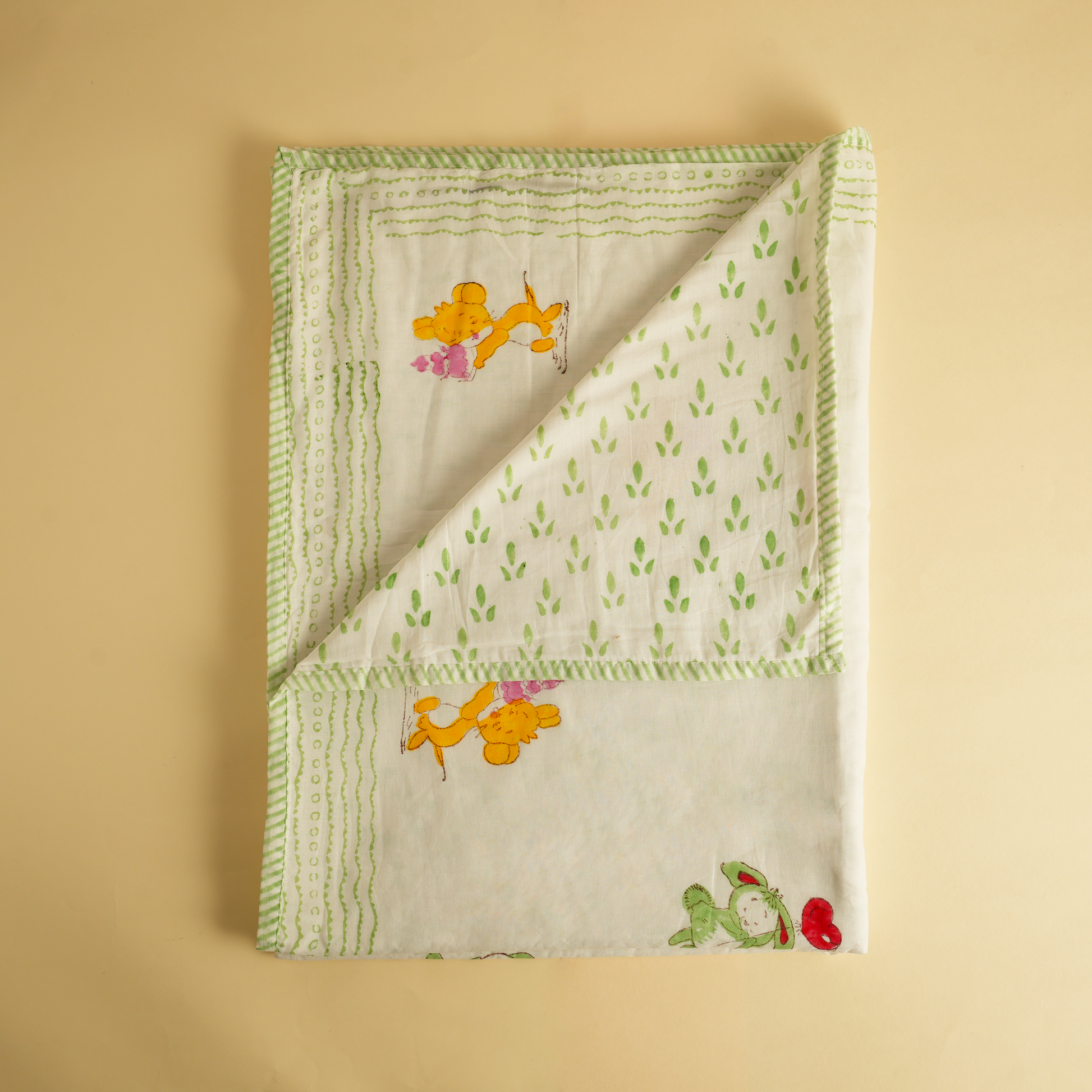 CARE & SAFETY Gentle machine wash or hand wash in cold water | Use mild, baby-safe detergent | Do not bleach | Line dry | Warm iron if needed | Natural variations in print are part of handcrafted charm